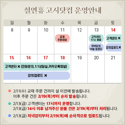 ¼³ ¿¬ÈÞ(2/14~2/18)¿¡ µû¸¥ °í°´¼¾ÅÍ ¿î¿µ ¹× ±³Àç ¹ß¼Û ¾È³»µå¸³´Ï´Ù.